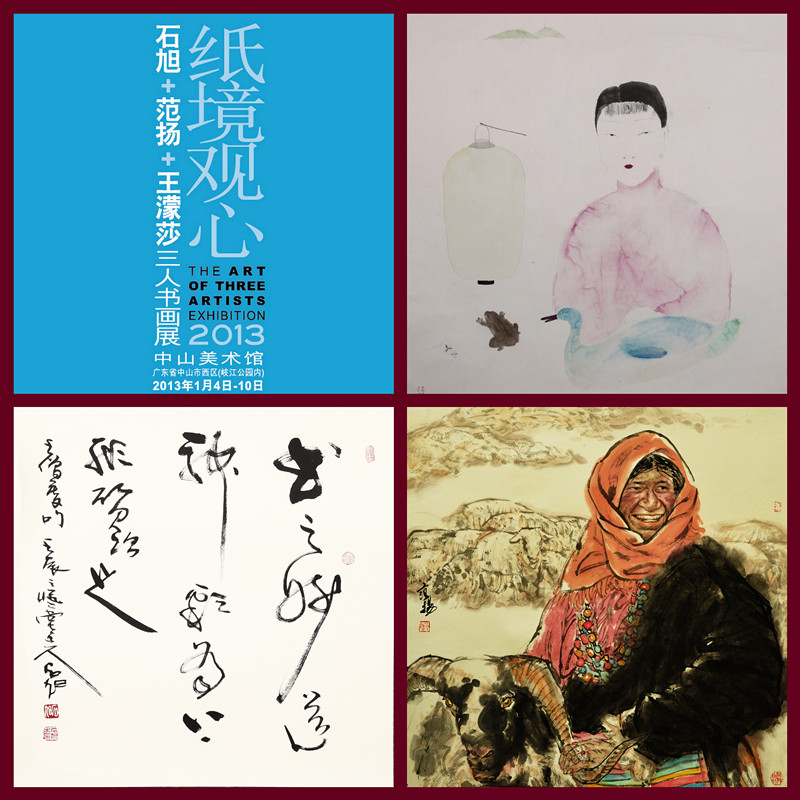 “纸境观心——石旭、范扬、王濛莎三人书画展” 于2013年1月4日至2013年1月10日在广东省中山市中山美术馆举行。本次展览由广东省中山市文学艺术界联合会主办,上海迈锡尼艺术品有限公司策划、承办,中山市美术家协会、中山达华智能科技股份有限公司、中山市嘉利印刷有限公司协办。