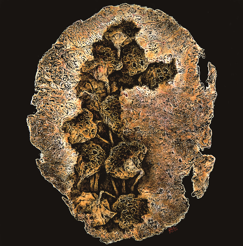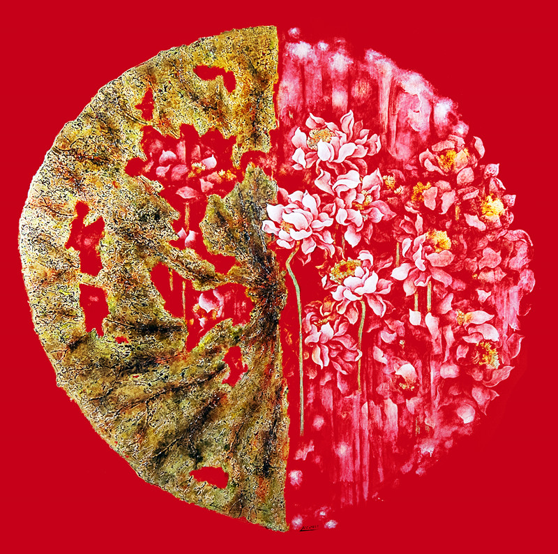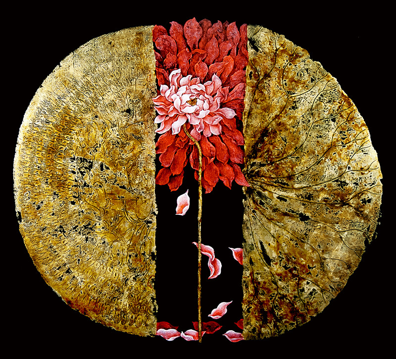 刘春潮的漆画是他赋于作品以理想与哲思的结果。他从生命意识和性的角度对“莲”提出了自己的哲思,对“莲”这一传统文化符号进行全新的阐释,在传统与现代之间找到了契合点。刘先生的作品多以黑色为底,加之红色的蝌蚪符号,是其对神秘深遂的生命和性意识的写照,而金色的莲蓬和奋进的蝌蚪则象征着轮回、生生不息的生命图景。他在作品中采用中国红(故宫红)、金佛手、千手观音、粉红莲花瓣等色彩象征和意象,以此传达吉祥喜庆、佛性、禅与爱的理念。除了运用中国传统漆画技艺以及“莲”图腾等大量中国文化元素外,其作品还在图式上采用西方构成,在圆形构图中求变,外方内圆,看似简单,却达到了当前国际流行的“少即是多”的效果,具有中国气度、大国风范。