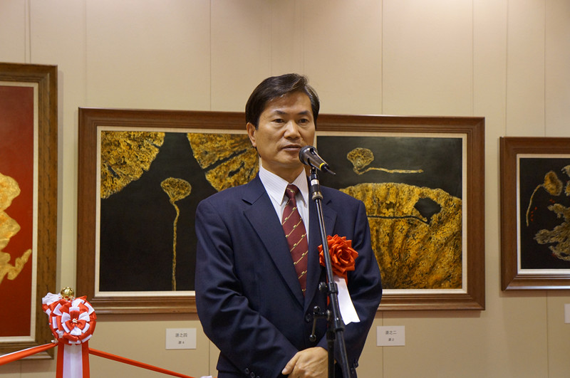 长崎县国际交流会会长高田勇、中山市文化交流访问团郑集思团长、长崎市市长田上富久、中国驻长崎总领事馆李文亮、作者刘春潮分别致辞。中山市文化交流访问团团长郑集思、长崎市市长田上富久、中国驻长崎总领事馆总领事李文亮、长崎县国际交流会会长高田勇、长崎县议会会长渡边敏胜、中日商务协会会长张书明、县文化旅游局长松川久和、县教育厅厅长渡边敏则、十八银行常务小川洋、广播电视大学校长东条正、中山美术馆馆长刘春潮、长崎电视台台长柿川照穗、安达株式会社董事长安达一藏为展览剪彩。开幕剪彩仪式后,郑集思团长分别为剪彩嘉宾赠送了纪念品。在整个活动过程中,日方对郑集思团长提出荷花的“和”与“合",两个中文的谐音,“和"是和谐、和平、和美、和畅、和顺、和解等等。“合"是合作、合力,合理、合法、合拍、合算等等概念表示高度认可。