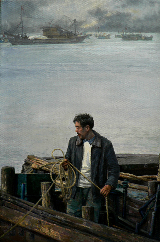 南京航空航天大学教授张利华老师创作的油画作品《船老大》,初看作品色调偏冷,即没有波涛汹涌的大海,也没有霞光万丈下波光浩渺大海,一望无际的海面上又显得非常的宁静,灰色的天空上仅点缀着霞光,船在海面穿梭着,人物看着又很淡定,整幅画面尺幅虽小,但作品画面由近及远,却显示着场面的宏大,表现生活对船老大的历练,具有坚定、沉着、大气的气质,及生活和大自然所带来的沧桑,都凝聚在他的形象中,他也在静静的享受着大自然给予他的恩赐。同时也告知人是自然中的一部分,依自然而生存发展,要热爱、爱护大自然,感恩大自然给我们的恩赐!画作也饱含着艺术家张利华先生强烈的个人情感与人文情怀!此作品在日本东京都友好会馆展览时,被日本的藏家收藏!